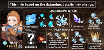 UDevilTakoyaki Thanks to Genshin Impact 21 beta and data miners we already have information on Aloys ascension and talent materials. This includes Aloy a character from Horizon Zero Dawn that was given out for free. To help you get a complete picture of the character and get a head start on collecting all of these.